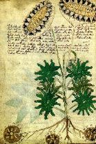 The 200 page book of bound vellum is written in undecipherable code and illustrated with all manner of charts and diagrams, strange flora and fauna, and bevies of nude women bathing. (top image is page from the Voynich manuscript)