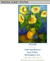 We have a long-time link to Jim Capozzola’s Rittenhouse Review on our site. Capozzola’s a local writer, and we recommend RR for its passion, its humor, its broad coverage of subjects and for the snarky terror alert feature — an image of just about anything under the sun that’s in the day’s security alert color scheme. (image is Friday’s terror alert feature — a painting of sunflowers by an artist friend, Gary Fisher.)