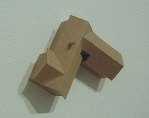 Both of Boyce’s tiny chipboard house models are of his childhood homes (right, “5223 North Chalet Court,” about 3″ x 3″ x 1 1/2″ deep from wall), and they are his idea of what an aerial view of them would be like. They serve as a backdrop for his memories. He also likes the surveillance quality, and zeroing in a cropping stuff out. At one point, he discovered he could zoom in on his childhood home (I’m not clear if he could view both of them) from a Website that had satellite photos of the area where he had lived, but that came after the inspiration for the work.