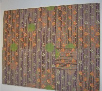 Schaefer comes from a fabric and silkscreening background, working with imagery that falls somewhere between commodity and fine art. By using modules, which work like tiles and have a commercial connotation, she is taking some of the personality out of the work. The owner can arrange the modules to taste. The imagery in this particular piece came from a 1930s decorative dishtowel. She was surprised at how, by putting together so many of the modules, the work dominated the space (right, “Per Square Foot”).Schaefer is putting chance in the hand of whoever shows her pieces, but not in their manufacture.