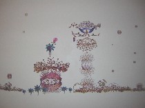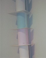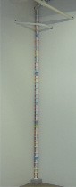 “Get Your History Straight,” (right) half the advertising slogan Philadelphia used to market itself to gays (the other half is And Your Night Life Gay) is a sort of deck of cards structure made from paint chips (also from Home Depot), the colors reflected on the wall. The pipe-like shape blends right in with the real pipes in the room, and the little gray (floor color) pedestal, just a box, really, elevates it again above the reality of the pipes, and again requires a slowing down to take in the magic.