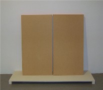 Yun’s pieces were chock full of other references. “Oh, C’mon” (left) were several pairs of particle boards edged in orange tape from Home Depot resting against the wall on a low, ceremonial pedestal, looking like tablets or scrolls or screens. The tape cast an orange aura on the wall behind, suggesting something almost religious or supernatural, or at least the idea of slowing down and taking in the magic of the world around us.