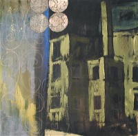 The layering, veiling and architectural blocks reminds me of work by Catherine Gontarek that showed at the Arts League (and got a nice review in the Inky from Ed Sozansky) in January, but Gontarek allows some personal darkness, inner space and serendipity to shine through her mix of swatches of fabric and blocks of paint (right, Gontarek’s “Night Behind the Corner”).