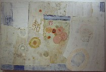 The piece with the strongest composition was “Universe” (top right), which almost suggested a human stand-in figure, the ground below, the sky above and scary stuff. A suggestion of personal content also came through in “Unfinished World” (left), with its dinner plate circles, suggestion of a window, some floaty biota shapes.