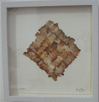 Klein also showed some small collages of used cigarette rolling paper that were beautiful and also based on multiples, to very different effect. The material, which seems like it is obsessively collected, is transformed into sepia-brown ink drawings that remind me of cedar shakes. The transformation into art has a calming effect on the material and what I imagine to be the process (image left, “1254”).