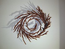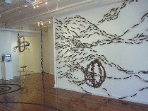 Using the individual pods that he collected in the Guyana jungle and in the Philadelphia area, Klein drew all over the gallery space. He arranged some in linear waves all over the walls. Others he strung into lianas, using them to draw in space, somehow finding remarkable variety both from the forms of the pods and the way he can make a linear lei into a thingamabob that has presence (left, front-and-center egg shape, “Kakaralli #3; below right image, “ClumpWallaba”).