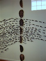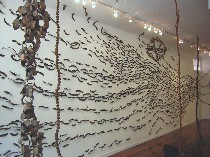 The use of such a bounty of multiples reminds me of Astrid Bowlby’s collages that take over half a room, and “The River” installation by Clay Studio 1999 guest artist-in-residence Sadashi Inusuka that also took over the most part of a room. Inusuka used 800 individual clay elements plus a slurry of clay on the floor to create an impression and make a statement about preserving nature. And Bowlby’s individual elements–collaged, drawn cut-out shapes–rise into the thousands until they create a dense 3-D landscape. Although the work of the three artists seems so different, the key element of bounty and intense procreation seems to underlie all of their work (right, Bowlby’s “Yonder”).
