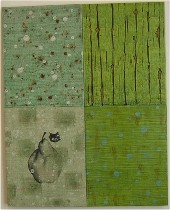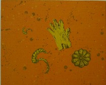 Also at Pentimenti are works by Kay Wood that have a swell sense of color. Some of her pieces, made from four smaller panels, have the feel of pieced fabric, because most of her paint has a woven look. She’s working on wood with acrylic, pencil and ink, and with collaged imagery that includes pods and pears and sea shell fossils that talk to Klein’s work in the next two rooms (image right, “Appear”).