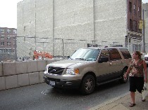 The first problem is the fencing in of the fence there (left), previously a popular spot for artists to mount their art en plein air. Now a second fence blocks the sidewalk, a parking lane and a lane of traffic. To put it another way, not only is the outdoor gallery gone, but the sidewalk is gone, parking on the west side of that block is practically eliminated–a disaster in a city where parking is an issue under the best of circumstances–and a busy two lane street now merges into a stop-and-go one-laner, emphasis on the stop.