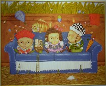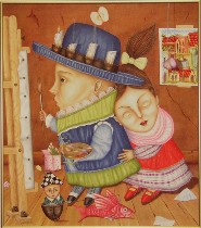 The subject matter seems to be love and family and daily life and who knows what else transformed by the magic of imagination and memory. I’d call it magical realism if it were a little more realistic, but what’s realistic about that work is not how it looks but the emotions it conveys–the pleasures of relationships and the sense of life as well as people are something to be embraced.