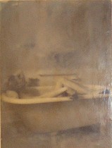 In the front room at Lapelle were encaustic sepia-toned nudes by Leah MacDonald that come straight out of Victorian nudie photographs. The technique was great, the subject matter questionable. But I suspect there are folks out there who might eat this up (urp, excuse me) (left, “Cloud”).