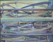 I also want to mention some paintings of machinery and abandoned-looking metal junk by Ed Marston at Muse Gallery. Marston got in a touch of politics in “Exit Strategy,” a painting of an old, found rusty exit sign. He said he was referring to the lack of exit strategy in Iraq.