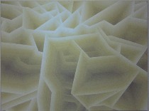 Alex Queral’s education was in this country, and Roberta and I had seen his phone-book portraits at the Painted Bride earlier this year in “Used: New Work from Old Things,” curated by Shelley Spector (Roberta’s post here). Imagine my surprise in finding this newer work was completely abstract–large paintings of straight, hard-edge lines creating space and the illusion of light, expressing a kind of yearning for something beyond. Several of the paintings were either grisaille or monochromatic, and Queral writes, were “influenced by the basic graphic look of comic books.”