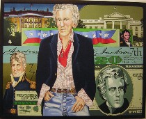 His collage-like portraits of political figures from the past can barely contain themselves within the canvases on which they are painted. He’s got George Washington, Thomas Jefferson, Abraham Lincoln, Ullysses S. Grant, etc., etc., all dressed up in modern garb and surrounded by images of the money that memorializes them as well as their signatures and portraits from the past.