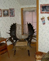 I suppose this other shot is a hotel, motel or guest-house room up north. The chair is made of moose antlers. If Alice in Wonderland had lived in Alaska, this is what her wing chair would have looked like.