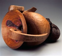 Australia’s protean Marcus Tatton, made a number of vessel-shapes as well, inspired by amphora. Tatton’s “Procreation” (left) was a Greek vase, its base a leafy acanthus-like curlicue inspired by the wood, its top a suggestion of wine “legs” clinging to the lip.