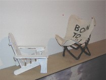 And while I’m on the subject of politics, Isaac Resnikoff‘s “Born to Kill” examines politics, art and American values. Resnikoff, who is a sweet fellow who definitely was not Born to Kill, has a killer sense of humor that had me chuckling my way through his roughly crafted show of anti-objets from the American dream (image right, “Seating Solutions for the Conflicted,” the miniature Adirondack chair emblazoned with Idle Hands, the butterfly chair with Born to Kill).