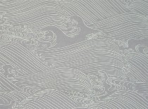 Nami Yamamoto‘s “tidal,” an undulating, wall-to-wall floor cloth, covers the front room gallery floor (installation shot left). The gray cloth is printed with stylized white wave and water motifs from 17th century Japanese paintings–perfect waves printed on perfect waves. Platonic and elegant.