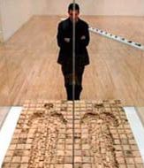 British sculptor Antony Gormley, who gave a slide lecture in Philadelphia recently (read Libby’s post), has a new old work debuting at Tate Modern, according to this morning’s Guardian. Gormley’s bed, made in 1980 out of 8,000 pieces of white bread (Mothers Pride) each piece chewed out so that the total vacuum approximated the artist’s body mass, is a work dear to Tate Director Nicholas Setota who, as a young curator, put it in a show. The work (the bread was dipped into hot wax to preserve it from molding), takes the outline of the artist’s body and looks like that other kind of mold. It reminded me of some Ana Mendieta body-impression works which I thought was an apt comparison actually. (image is Gormley standing in front of “Bed”)