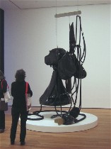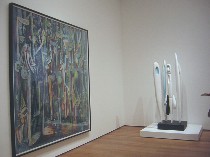 Tom Wesselman’s relief kitchen, and Claes Oldenburg’s droopy “Fan” (left above) which made me think of Louise Bourgeois‘s “Quarantania” upstairs, with its hanging bags suggesting body parts (right, “Quarantania” installed next to Wilfredo Lam’s “The Jungle”, both talking to eachother with their groupings of ectomorphs).