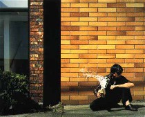 Photographs have been elevated from the nether regions to a nice space of their own (no images; they didn’t allow picture taking in the photo section; I grabbed these off the Web, for better or worse). Photo has lots of new acquisitions, incuding a swell Andreas Gursky, “Tote Hosen,” taken at a rock concert in Germany and pieced together by computer wizardry and weirdness; some Philip-Lorca di Corcia photos that looked staged and candid at the same time; a Jeff Wall giant lightbox of a picture, “Milk,” (left) in which (I think) he continues his salutes to Hokusai by freezing in mid-air a wave of spilt milk emitted by a little milkbox held by a scruffy young man in a scruffy urban milieu;