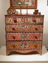 In addition to covering a host of musical instruments (guitars, flutes, banjos, tambourines), the artist, who sometimes worked with his son, Jose Felipe, adorned the following: lamps, dressers, plates, chairs, a typewriter, several telephones, a cane, binoculars, a 78 rpm record, ping pong paddles, a stool, trays, a model ship and other real world objects. The aesthetic is suffocatingly pretty and masculine.