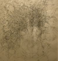 And in More’s front room, Michael Rossman, magician with a pencil, arranges his skittery lines into hallucinations that imply the real world of architecture, furniture, landscape but also the interior life of the mind working to make sense of the world. In what gallery owner Charles More said were the newest pieces, Rossman has drawn weird and wonderful emanations of flowers and vases. (image is “Bouquet”). I can’t help but think of Christine Hiebert‘s skittery line works (now at Gallery Joe) when I think of Rossman’s. Both artists translate the world through a nervous energy that denotes emotion. Rossman is more forthcoming about what’s on his mind, which helps the viewer connect with it. Hiebert, whose work I like, has let go of imagery entirely and asks the viewer to jump off the cliff with her — something few are willing or able to do.