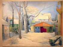 Reisman’s works, a few set in Ocean Park (presumably, the Ocean Park of California made famous by Richard Diebenkorn) but most set in Narberth and other suburban looking places,are mystery charmers whose pretty colors and lovely hulking nature belie the fact that there are people — somewhere — in these houses. Indeed there are and as I spent more time with the works I noticed that Reisman, who teaches at Swarthmore and has shown with the gallery for years, has placed images of people — single individuals and couples — here and there, almost invisible, in the shadows. Mostly, they’re inside, as you would expect in suburban scenes where, unlike in the city, people do their living indoors and there’s not a lot of neighborly outdoor interchange.