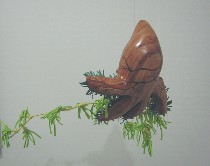 Like so many young landscape artists, Hobbs is working with materials that scare me to death–glassy resins for layered paintings that look like jewels, cast fiberglass for wood-like lands of Wynken, Blynken and Nod and wooden shoes that sail the sky, safe caves, and hands holding the landscape safe (left, “Untitled,” materials fabric, fiberglass, paint, wire).
