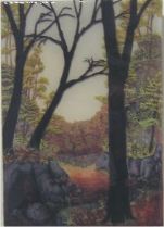 Also showing at Vox, “Bad Intentions,” Mauro Zamora‘s acrylics an water colors of nature retaking man-made spaces. The monochrome images have a silk-screen affect of layers and sharp edges. I want these to be more interesting to look at (left, “Trees and Glass, 12″ x 16”).