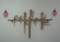 William Lohre‘s untitled show mostly of untitled models made of paper give as little away as he seems to desire (no titles, no list, no nothing). His White House has artillery and missile launchers on top; his gun rack has a pair of American flags; and his medieval castle/fort is another place that implies embattlement and a desire for safety. I can’t get much further than craftsmanship and ships in bottles–i.e. how does he do it, although he does do it nicely.