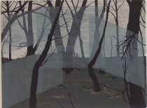 I can see the relationship of his subject matter to Clare Rojas‘ funny little gouache drawings of primeval territory (Rojas had a nice thumbnail review by Roberta Smith in Friday’s New York Times, fyi) and Paul Swenbeck’s references to Germanic legends as well as to the woodblock plates that accompanied my childhood copy of Grimm’s Fairytales. The results are magical and worth a visit to Vox.