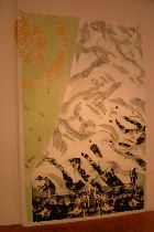Most notable in a very large exhibit are Nic Coviello‘s “work in progress,” a layered abstract mural in shades of green, gold, cream and black that I just adored. Coming so soon after Coviello’s solo exhibit at the gallery, it is a surprise and pleasure to see the artist working in a new scale and attempting to break through to a new way of working. (image above is Coviello’s mural, sorry the shot is a little dark)