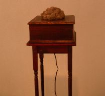 Unfortunately, next to Coviello’s piece is Jody Sweitzer‘s noisy “Pushy Merkin,” (shown left) which is a space invader, aggressively coloring the psychic space in the gallery with its insistent soundtrack. Sweitzer’s multi-media piece resembles a bad wig enthroned on a Victorian end table — and sounds like a horror flick without the music and cathartic blood bath. It’s melange of heavy breathing, cat screeches, more heavy breathing, thumps and bumps looped without appreciable buildup, climax and release and made me edgy enough to abbreviate my stay in the gallery.