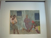 In the upstairs gallery, which seemed pretty much the same amazing size, PAFA unveiled “The Chemistry of Color,” a show of African-American art, most of it given to PAFA this year by Harold A. and Ann R. Sorgenti. Like downstairs, the space, cluttered with the tables and chairs, seemed to devour the work, some of which was pretty lively and would have looked great in other circumstances. (Center three pieces from left to right, “New Depths,” 1989, by Charles Searles; “Tar Beach #2,” 1990, by Faith Ringgold, and “Water Series #30” by Yvonne Pickering Carter). The exhibit also includes works by Syd Carpenter, John Dowell, Betye Saar, Jacob Lawrence, Willie Birch and scads of other notable artists, local and not local, with noteworthy work.