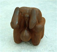 Macrocosms and microcosms enchant him. He takes plugs out of a chair and with them builds a mini-version in “Shrink;” he grinds his fingernails, hair and superglue to construct a 1 1/2″ long egg, “Egg” (right, “Shrink”).