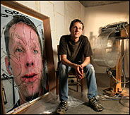 While Christo and Jeanne-Claude were imprinting their own brand of wonders on Central Park, over at the Whitney, California artist Tim Hawkinson had created a big top of his own, an entire floor of trompe l’oeil 2- and 3-D wonders and Rube Goldberg gizmos (here’s a picture of him with “Emoter,” a self-portrait that moves). hawkinson, tim