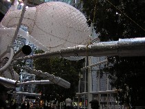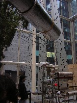 “Uberorgan,” which combines sexy, floating bladders and spectacular horns straight from Gabriel’s mouth, plays music, using an analog of an enormous player-piano roll to program the notes (image right, and for an online video about this, go here). Water dripping on pie pans is the music of his tree of twisted polyethylene, “Drip”–the sequence also roller-controlled and apparently somewhat arbitrary.