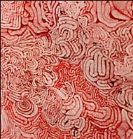 He draws a 420-inch scroll that looks like a map of intestines all in shades of red, calling it the “Wall Chart of World History from Earliest Times to the Present” (detail, left). Then he encases all the red pens and pencils he used into a giant polyester resin finger tip, the red leads poking out looking like a cross section of bloody veins packed into place.