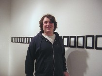 Roberta’s going to have a lot more to say on this one, so I’ll switch here to the back room, which is one enormous conceptual joke, based on Matthew Brownell’s private life as a tv slacker. “Wish I Wasn’t So Lazy” is as charming as conceptual, word-art can get, and it had me laughing out loud (left, Brownell with a detail of “It’s the Little Things in Life,” 50 framed scripts of television advertisements).Brownell, who studied photography at Penn, lost the photo facilities and his whole m.o. for making art upon graduation. “I was addicted to the clarity of the 4-inch by 5-inch negative,” he said. “I hated 35 millimeters.” But all he had was a 35-millimeter camera.