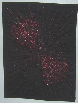 “Two Hearts” (left, 8.75″ x 12″) isn’t pieced, just quilted, but the thread is metallic, and the stitchery is the subject, following no pattern but creating the image of the two hearts and radiating spokes of love.