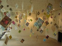 The show is crammed with zines that rain from the ceiling. After the gauntlet of words, images and paper, there are shelves with zines, a sofa for relaxing with zines, and shelves filled with related art forms–mail art and underground music recordings and covers–also mailable.