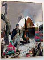 Not only is Neo Rauch a painter of huge works, loosely stroked, scumbled and dripped into shape but he’s possessed of exceptional colors in his palette (who else dips into the acid greens like this guy?). His works are Brechtian and theatrical. In Rauch’s stagey tableaux with militaristic and industrial undertones people always seem to be taking a meeting of some kind (planning an insurrection? debriefing after some action or other). Symbols abound. There’s one recurring figure who is a half-man half-animal hybrid whose sole purpose seems to be stirring up some trouble. (see image right) People often wear uniforms of no apparent country or time. Some of the uniforms are colonial era and in one particularly wintry work the ambiance was George Washington at Valley Forge — although Candyland is suggested as well in the pink and blue objects that look like game tokens on the sled. (image below)
