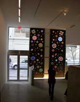 COFA’s new storefront gallery has a nice, open step-up space in the rear where the works glow in the dark. Like in church, there’s a bench to sit on and looking back over your shoulder you can see the artist’s window installation, a rosette-happy two-panel piece that pushes the religion/no-religion edge of the stained glass form. Schaechter’s rosettes evoke the world’s cathedrals but they don’t conjure a godhead. Rather what they conjure are baubles and jewels whose delights are sensual; what they conjure is Tiffanys and Cartiers and a pirate’s chest full of booty. Some of our party didn’t care much for them but I loved the big dark windows with their almost too rich ambiance. It’s either the Catholic in me enjoying a poke at those church windows — or it’s the kid in me. Bright, shiny, colorful, pretty? What’s not to love. (image is those rosettes)