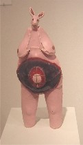 Close by were Nicholas Lenker’s clay sculptures of holiday spirits. Lenker, according to his statement, was brought up as a Jehovah’s Witness, so ordinary holidays were forbidden–and mysterious–to him. Here’s “The Birth of Easter” (right), an imagining of how such a holiday could come to be, and also an imagining of wildness and fertility. He also had some armless gryphon-headed “people” in stripes called “April Fools.” All his pieces had a Medieval affect, sort of like court jesters and celebrations gone wild–religion mixed with pagan rituals.