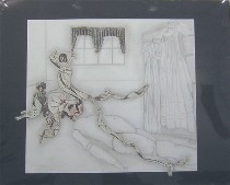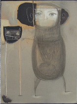 Also there, a variety of pieces by Sissy Pizzolo were based on dolls and a sense of loss. I liked the drawings with Xerox best. The combo of the drawing and collage were loopy, and the way Pizzolo broke the edges of her paper and marched fearlessly with her collaged xerox into the black border was swell. Other pieces were stitched and fierce (image, “Empty Dresses”).