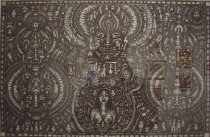 At Fleisher/Ollman, Huston Ripley’s ink on tissue dot matrices reminded me of a sexy version of Adolf Wolfli’s bordered and rohrshach-looking creations, little faces embedded in big ones embedded in big figures. (Ripley’s “Untitled,” 12 1/2 x 19 inches).