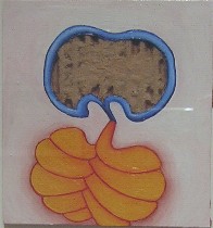 Also, Linda Stoudt’s pop cartoon inspired oil on gessoed paper or cardboard pieces are reductive natural (and not so natural) shapes in intense colors, some of them with peeled corrugated cardboard becoming part of the composition. The Don Colley notebook pages were fun, exuberant, but I wasn’t sure why they were getting the full Leonardo daVinci treatment (image, Stoudt’s “Quote.”)
