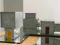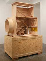 Schutte’s austere archictectural models for ‘One Man Houses’ were a jolt after the obsessive details of Harkness. That’s not to say that Schutte doesn’t have his own obsessions. The perfect form would be one of them. But the perfect form for what? That’s something that we’ll figure out as we go. (image is “One Man Houses” 2003, metal, plastic, mirror, mixed. house: 15″ x 57 5/8″ x 50″ crate 50″ x 66 1/4″ x 58″)