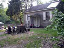Lang‘s instrumental music seems much more in tune with the idea of the old abandoned house in the woods which once was alive with voices and activity but for so many years signalled — with its abandonment — failure and loss. The music, which is outside and seems to emanate from the woods, is not heard inside the meeting house. Lovely, melodic and somewhat sad, the music connects with hymns, Quakers, and the idea of carrying your message outside your house and into the world, which is what Quakers (and all religions) try to do. In any event, it’s delightful. Lang is the founder and artistic director of New York’s “Bang on a Can.”